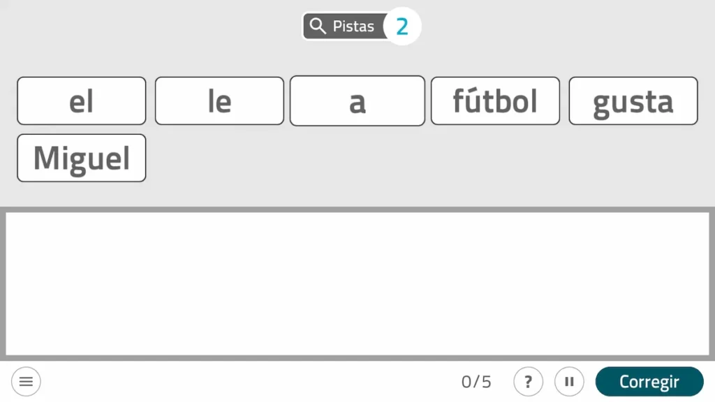تتضمن هذه اللعبة القابلة للتخصيص من NeuronUP ترتيب الكلمات المعروضة لتشكيل تراكيب نحوية متسقة.
