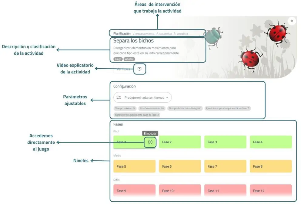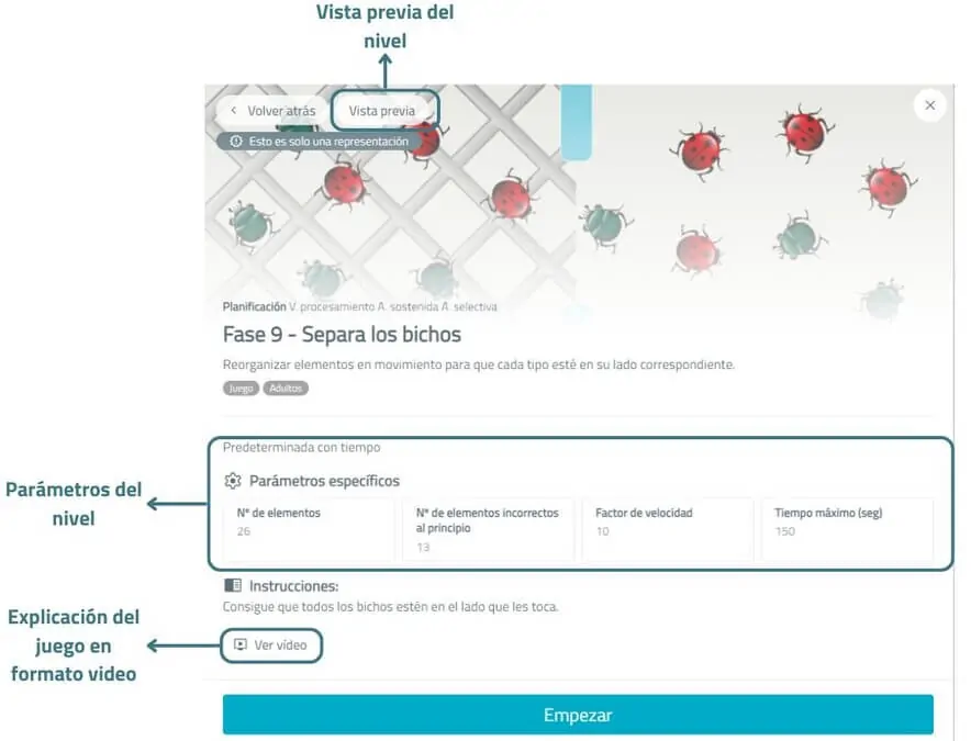 وإلا، فستتمكن من الانتقال إلى شاشة أخرى حيث ستجد معاينة للمستوى، ومعايير المرحلة وشرحًا مرئيًا للنشاط. بهذه الطريقة، ستتعرف على عناصر كل مستوى قبل بدء النشاط.