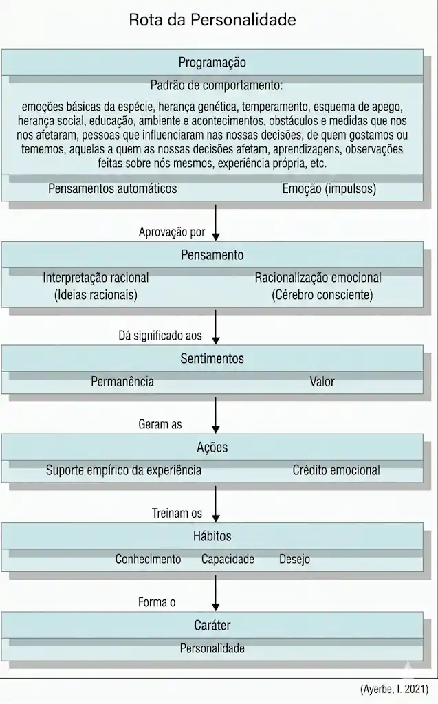 A rota para alcançar essa competência social da personalidade madura, que determina os padrões de comportamento das pessoas, requer derrotar os pensamentos automáticos com a ajuda da interpretação racional; para tanto, a interpretação racional confere significado aos sentimentos; estes ganham crédito emocional e suporte empírico da experiência com as ações; em seguida, as ações treinam o hábito integrando conhecimento, capacidade e desejo; e, finalmente, o hábito molda o caráter que define a personalidade.