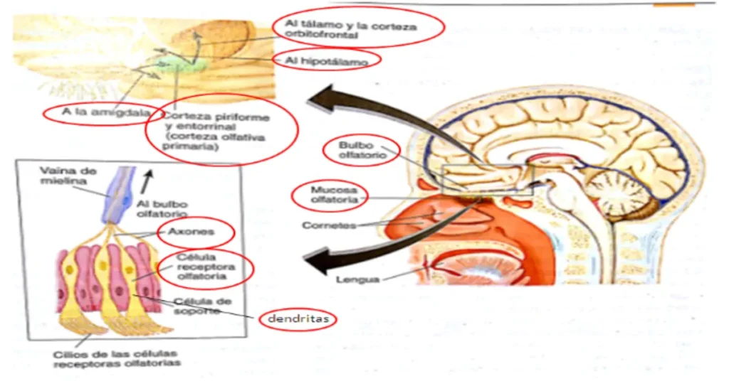Os receptores enviam terminações através da superfície da mucosa, que se dividem em cílios. As membranas desses cílios contêm receptores que detectam moléculas odoríferas dissolvidas no ar que alcançam a mucosa olfatória. Os axônios dos receptores olfatórios passam pelos orifícios da lâmina cribriforme em direção aos bulbos olfatórios, onde formam sinapses no glomérulo com os dendritos das células mitrais. Esses neurônios enviam axônios, através dos tratos olfatórios, ao cérebro, principalmente à amígdala (relacionada com as emoções), ao córtex piriforme (processamento da informação) e ao córtex entorrinal (memória, orientação e aprendizado). O hipocampo (aprendizado e memória), o hipotálamo e o córtex orbitofrontal (tomada de decisões) recebem a informação olfatória indiretamente.