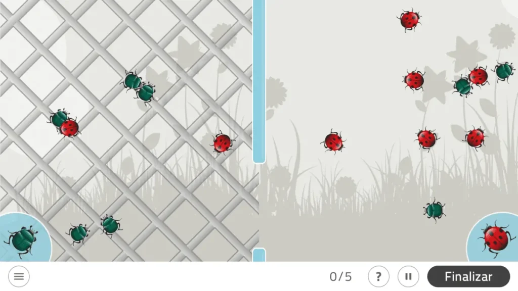 Das Spiel Trenne die Käfer besteht darin, die Käfer je nach ihrer Farbe auf der rechten oder linken Seite des Bildschirms zu platzieren, abhängig davon, wo sich das Modellkäfer mit seiner jeweiligen Farbe befindet. Rote Käfer werden auf der rechten Seite platziert, grüne Käfer auf der linken.