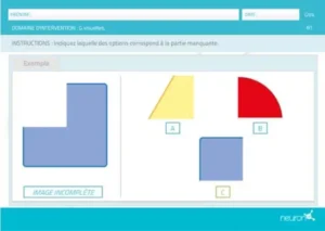 L’activité Images incomplètes consiste à observer une image partiellement présentée et à sélectionner l’option qui complète correctement l’image parmi plusieurs propositions.