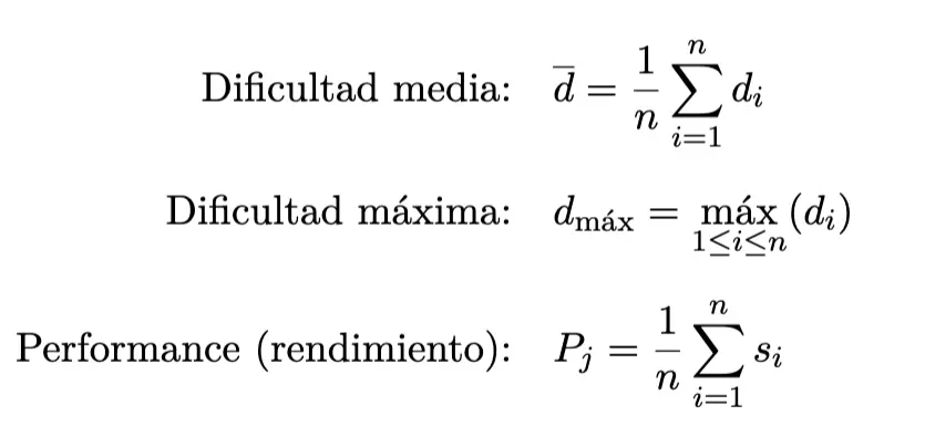 - PjP_jPj indique la performance moyenne de l’utilisateur dans une activité, sans pondération par la difficulté.