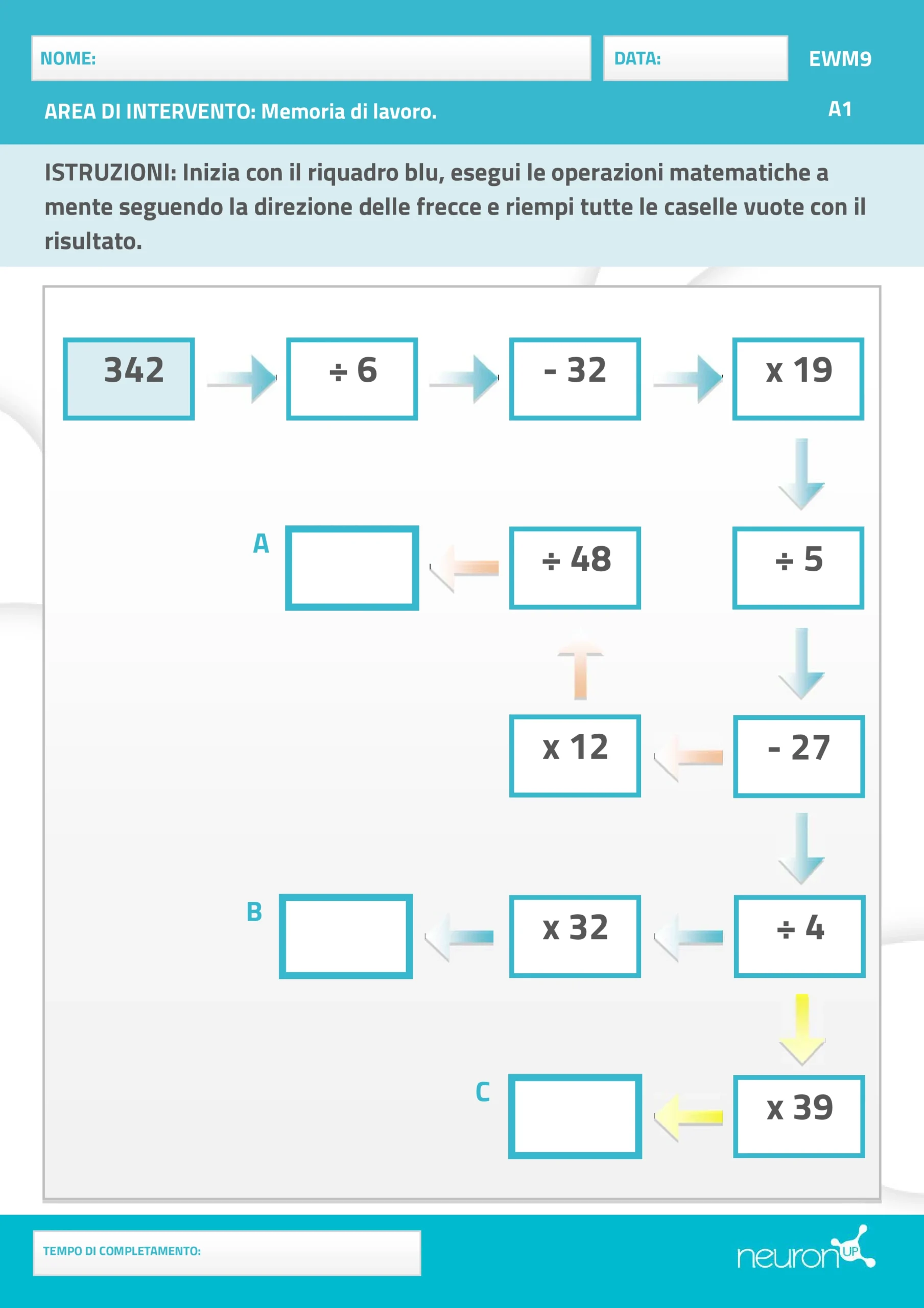 Consiste nel risolvere una serie di operazioni matematiche collegate tra loro, in cui il paziente deve mantenere mentalmente i risultati parziali per arrivare alla soluzione finale. Attraverso sequenze numeriche progressive, la persona deve applicare le operazioni in ordine (addizione, sottrazione e, nei livelli più avanzati, moltiplicazione o divisione), rafforzando la capacità di trattenere e aggiornare le informazioni mentre ragiona in modo sequenziale.