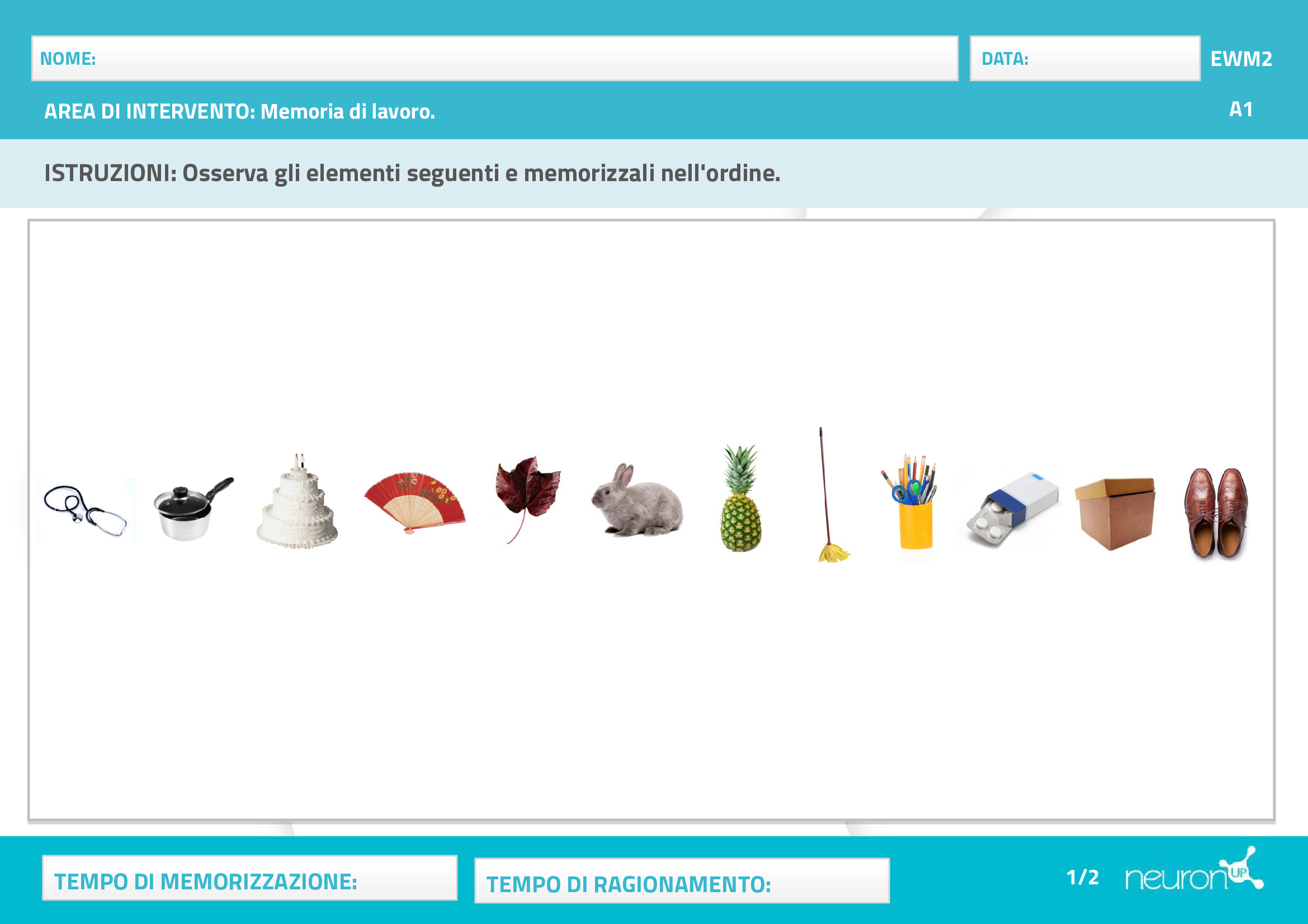 La scheda “Memorizza la sequenza di immagini” lavora specificamente sulle facoltà di memoria di lavoro e memoria sequenziale dei pazienti adulti.