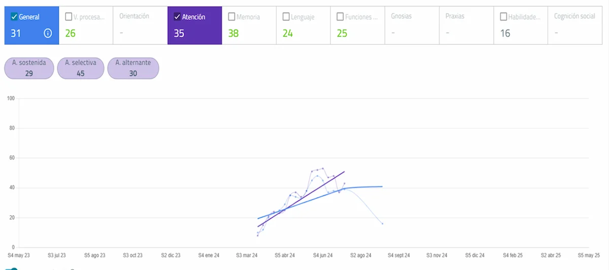 Как мы можем наблюдать, это показывает положительную тенденцию в его когнитивной работоспособности по сравнению с началом сеансов с NeuronUP год назад.