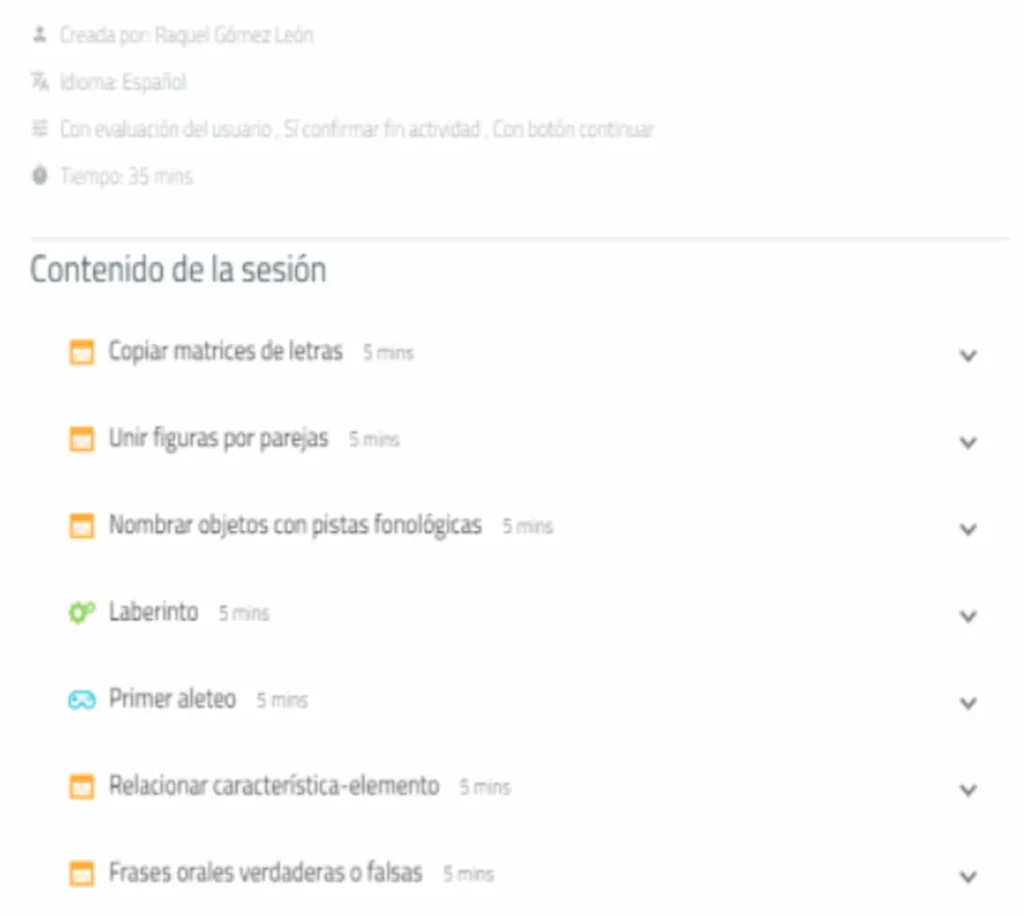 Этот первый еженедельный сеанс для работы с этим человеком с интеллектуальной инвалидностью состоял из следующих заданий NeuronUP: